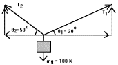 Solution: mg = T1 sin θ1, + T2 sin θ2 100N = T1 sin 20o, + T2 sin 50 o T1 cos 20 o = T2 cos 50 o T1 = T2 cos 50 o / cos 20 o 100 N = T2 cos 50 o